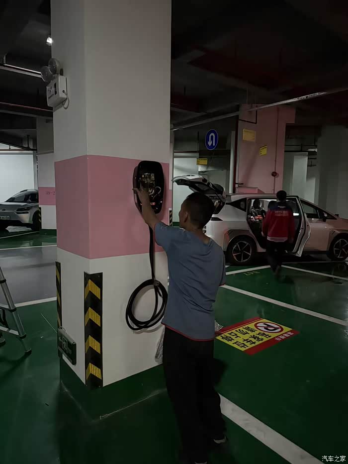 电表装好后和装充电桩的师傅确定了安装时间,两个师傅带着充电桩和材料过来。本来是包含30米的材料,但我车位到电表的位置是32米,超出2米每米30块,这里就是60块自费,还有顶上面没有挂电缆的地方需要打吊钩,总共是打了16个,每个十块钱,加起来一共自费了220块,价格也不贵能接受,毕竟外面买一米6×3平方的线我看都是20块了,再加上pvc的线管差不多也这个价。