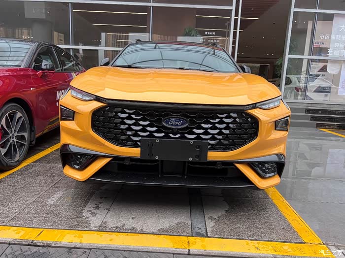 参加完车展发布会后几天,和朋友借着机会,顺路到一家4S店去试驾福特蒙迪欧运动版。刚到4S店门口,就看到这台橙色的运动版ST-Line和蒙迪欧停放在门口特别显眼,我相信每个从这里路过的人很难不注意到它。运动版和轿车版相比,格栅大了许多,这应该是一眼就能区别运动版和轿车版的一点。