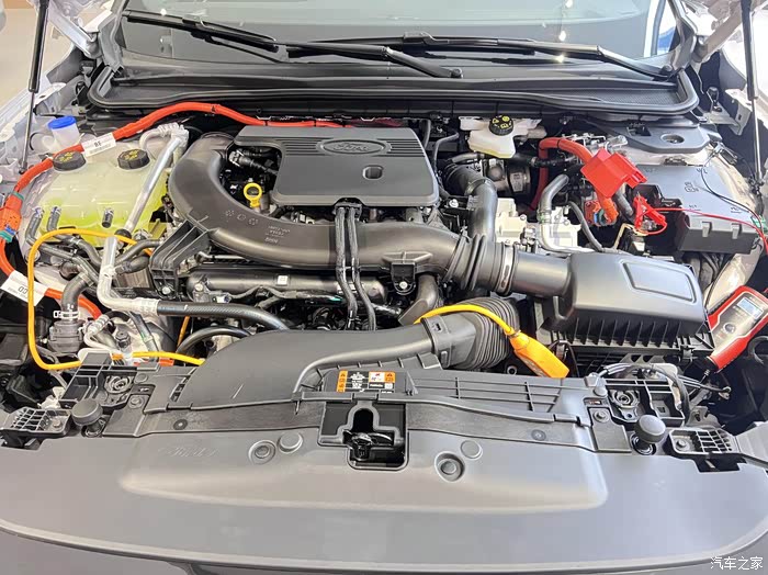 打开引擎盖就看到了蒙迪欧运动版的大心脏,整个是一台2.0T的E混动力系统,最大马力有300多匹,大家车之前测过这车的零百,可以跑到5秒多,这加速体验完全可以跟3.5L V6发动机比了。