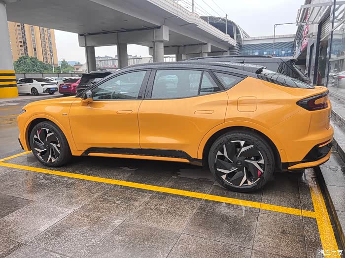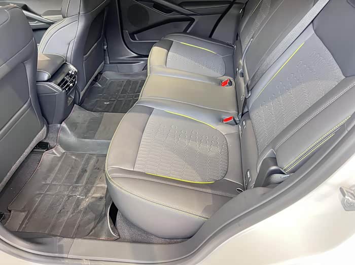 内饰方面,前面还是一块贯穿式的大连屏,方向盘的握持手感很好,旋钮换挡、无线充电都差不多,黄色是装饰确实能够让人感受到一点运动氛围,座舱空间很宽敞。