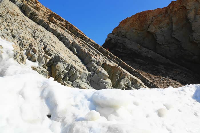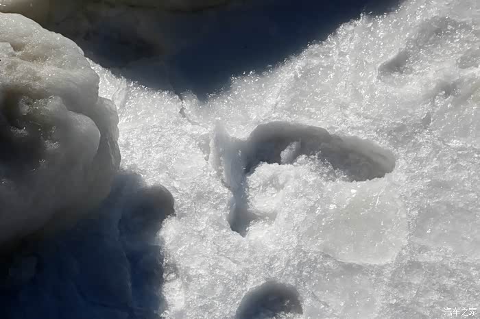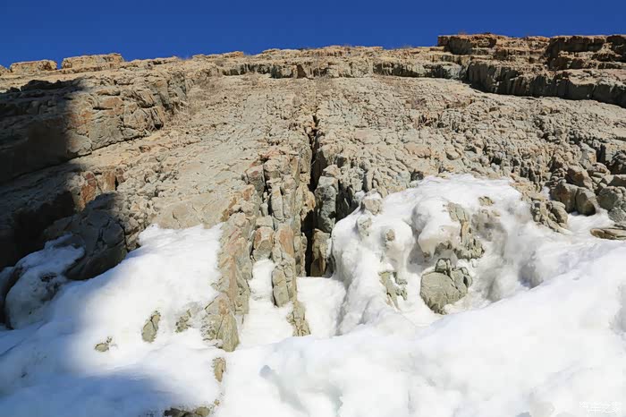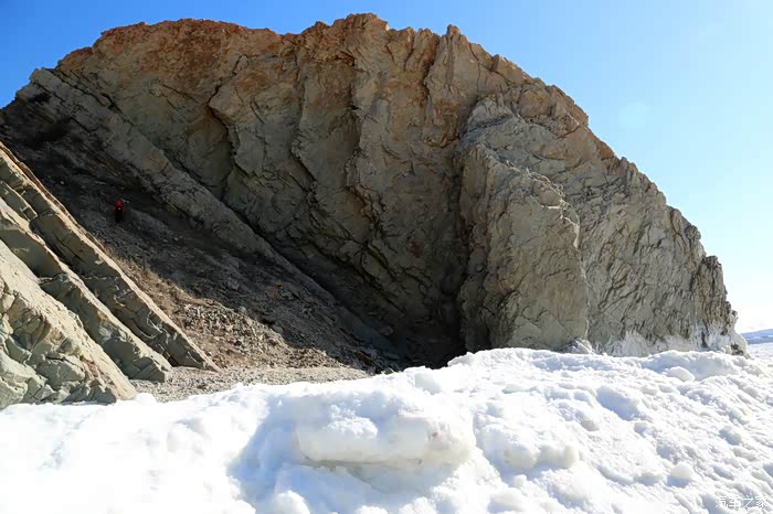 一直在石猴附近转悠始终得靠前,欲往山崖背后的大排石也便成了徒劳。于是,我们略带遗憾地原路返回崖上。我竟然一步一回头,对这不同凡响的冰海奇观恋恋不舍,生怕它从眼前消失。
