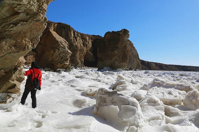 重新回到崖上,明显感受到偏北的海风带来微微的凉意。但放眼望去,视线毫无阻挡地越过冰封的海面直抵远方的天际线。上无飞鸟、下无舟船,天蓝海白,满眼的色彩都是一样的纯净。这些简简单单的色彩与线条,和刚才伫立冰海的巨石一样,都是大自然不可多得的画作,只是风格不同罢了。至于那些毫无规则的冰块,则是神秘的拼图吧?