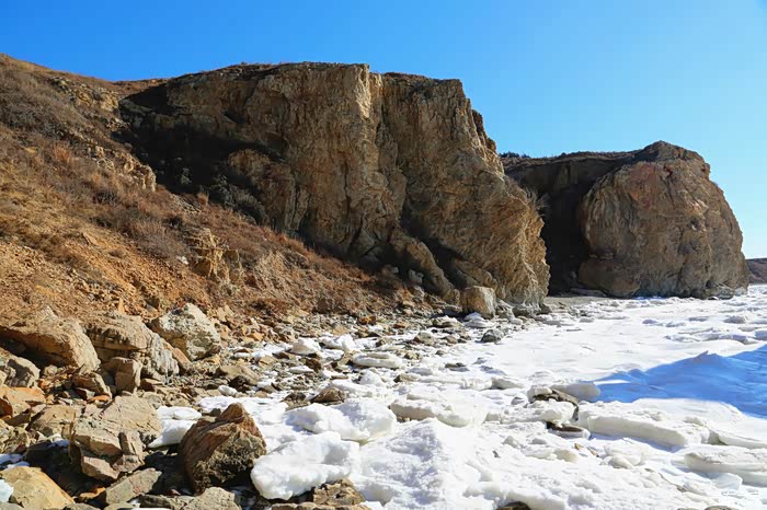 反正,在来到大排石村之前,我对冬天的大海的好奇远大于喜欢。实际上,好奇最后又转变成了喜欢。大排石村是位于大连瓦房店市驼山乡境内的一个渔村,因附近有一排礁石伸向海中而得名。更为奇特的是,海边的石壁崖体呈土黄色,十分陡峭,如刀削斧劈般屹立于海边,经海水长时间侵蚀,形成了独特的海蚀崖。