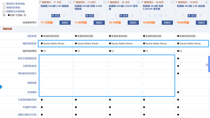 丰田凯美瑞引以为傲的是智能配置方面,高配车型增加了车道居中保持、道路交通标识识别等功能,整体达到了L2+的水准,但笔者认为缺乏诚意。