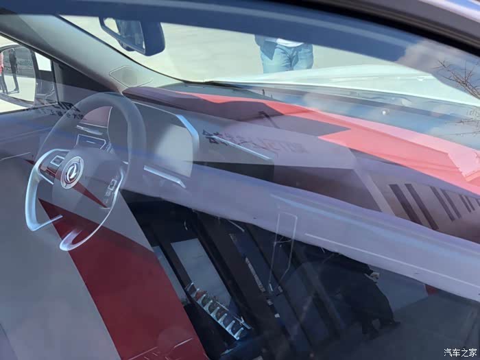 室外的展车不允许开门拍摄,隔着玻璃凑合看下..红色的中控台很显眼