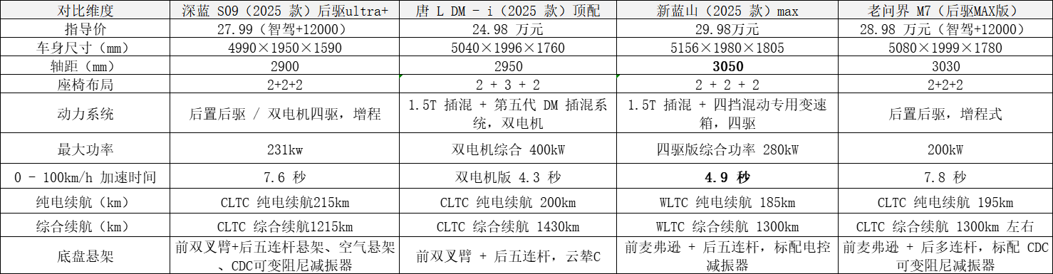 30w以内的6座选手挺多,先后对比了下,最终从深蓝S09、唐L -DMI、昊铂HL混动、新蓝山、领克900、银河M9、老款问界M7中选。昊铂HL、银河M9因为混动上市时间太晚,领克900预算略超了,最终深蓝S09、唐L -DMI、新蓝山、老款问界M7进入决赛圈。