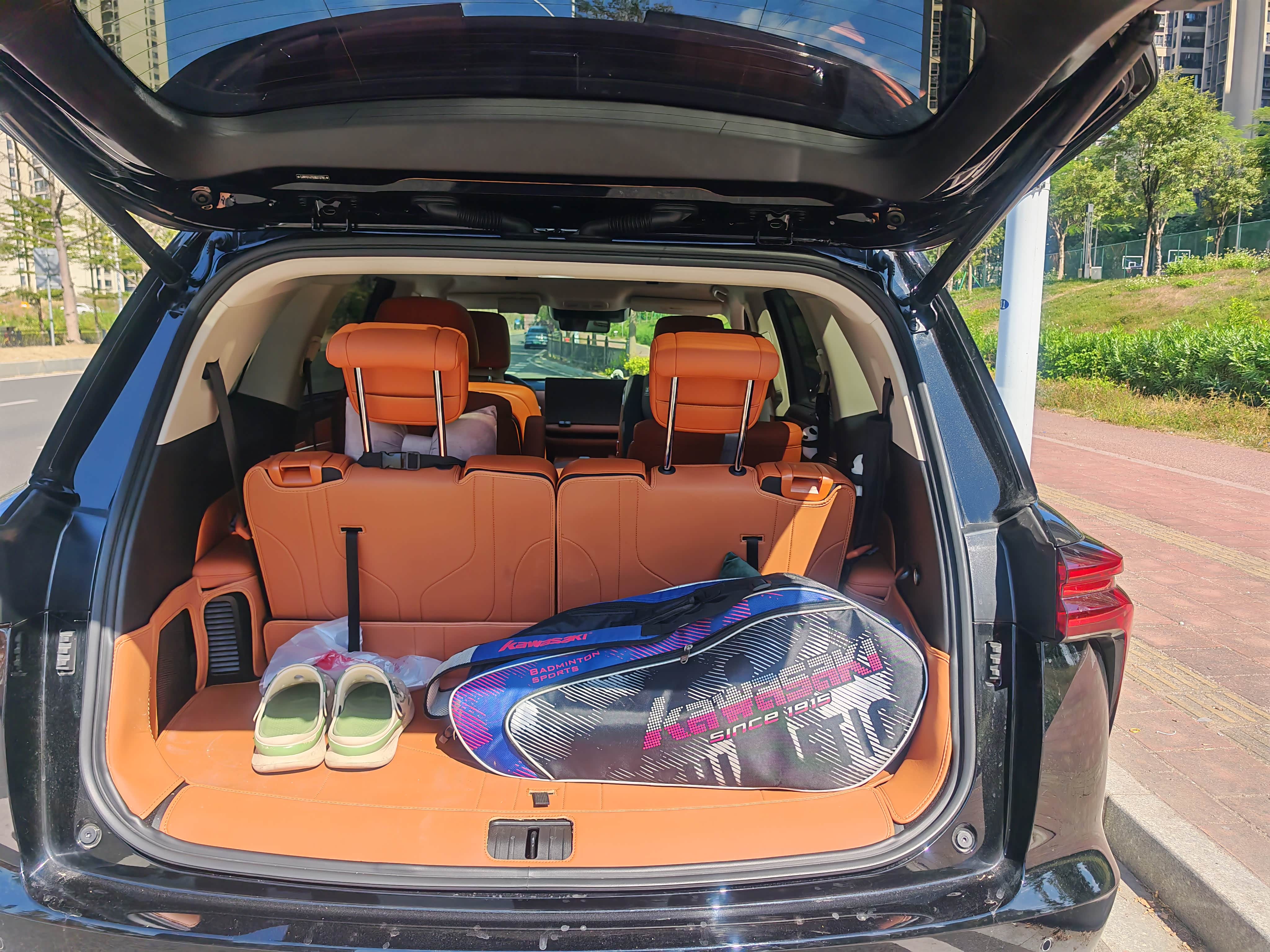 新蓝山的空间表现不错,车长5156mm,但轴距达到3050mm,前两排座椅宽敞舒适,第三排腿部空间充足,中间过道方便进出,放倒第三排后备箱容积超大,露营装备轻松容纳,还能临时坐人避雨。在满员的情况,后备箱看着小,实际很能装。