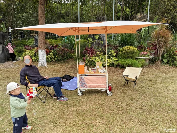 装备的话首先是图中这个带天幕的推车,这个推车除了带天幕还带一个小桌板,铺在推车上面就是一个小桌子,然后就是几个沙滩椅,一个露营垫,当然还要带上飞盘和娃一起玩,还带了一个电动的吹泡泡机,剩下就没啥了。