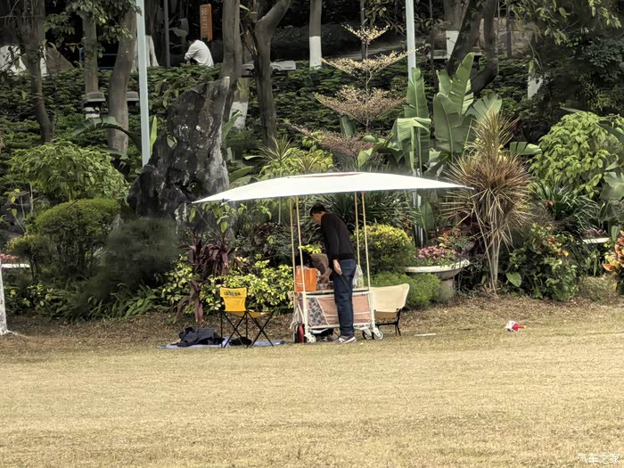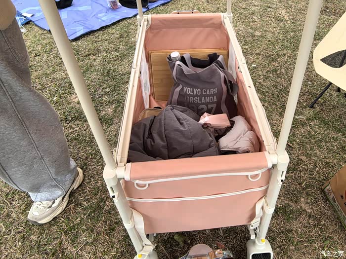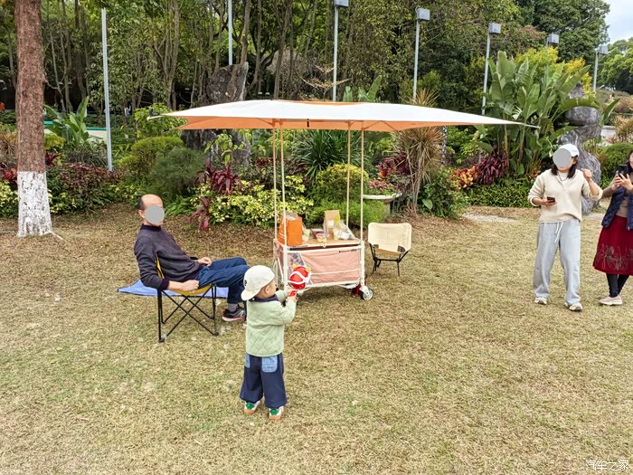 当然装备中比较重点的就是这个带天幕的小推车,因为公园是不允许在草地上扎钉子的,所以一般的天幕是无法在公园草地上使用的。但这款不需要拉斜撑在地面。直接固定在这个露营车上。所以我们也是现场唯一一个有天幕的露营的。