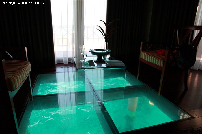 室内有透明玻璃,下面打着灯光,夜晚灯光会吸引来很多小鱼: