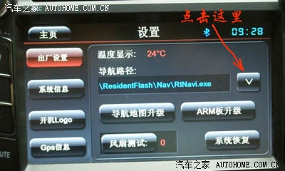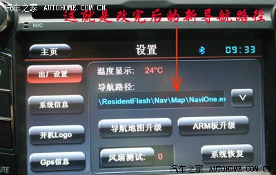 4.点击导航路径右侧的下箭头,设置导航路径为\ResidentFlash\Nav\Map\NaviOne.exe的凯立德文件,具体请参照下图。。。。。然后点左上角的“主页”,回到正常界面,完成!