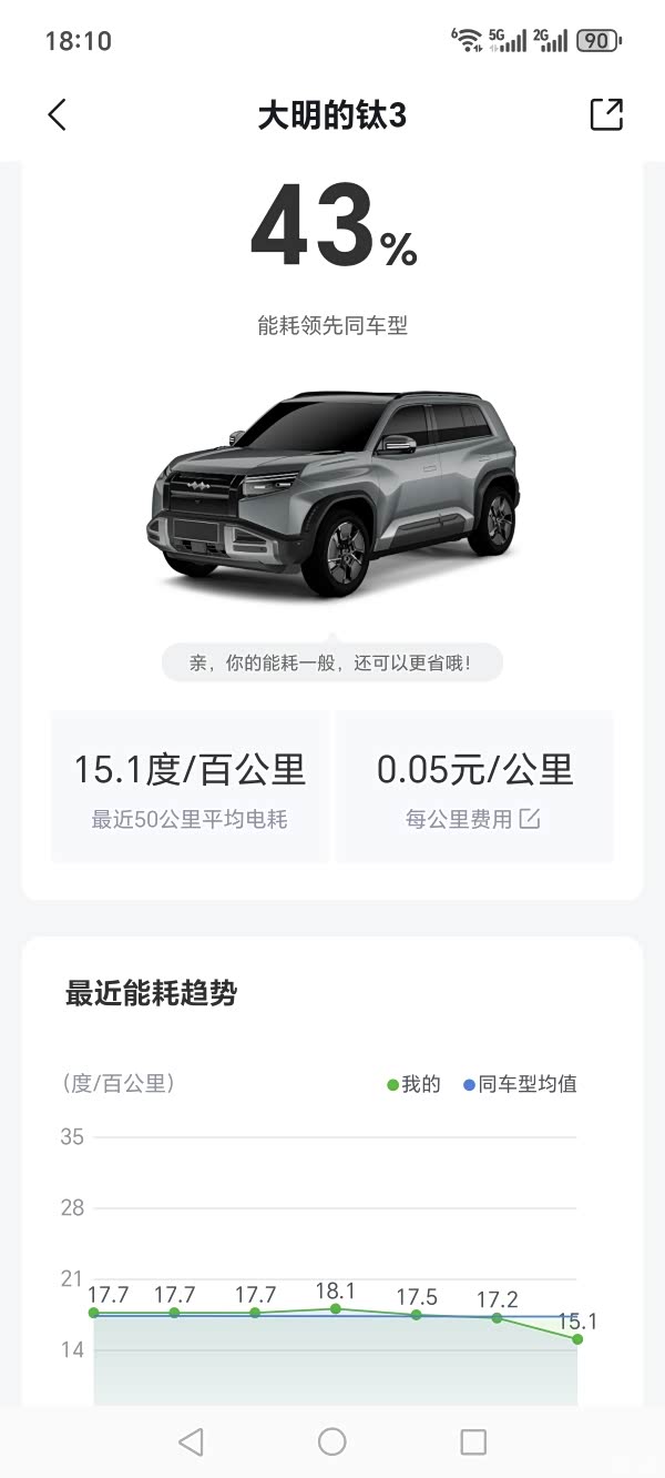 提车前几天因为天气还冷,加上脚法还不行,电耗都在百公里20多度,开了两个多星期,脚法好点了,天气也热了,电耗现在降到16~18度了。