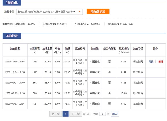车子油耗还可以,不算高。第一次油耗10.03,L,油耗见下图,呈下降趋势,平均油耗9.1L.最近油耗8.05升。应该算中等,我在口碑中看到有的车友7.2升,应该是个老司机,具有良好的驾驶习惯,我估计我开不了这个油耗。向这个车主学习!!!!
