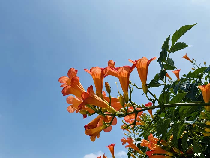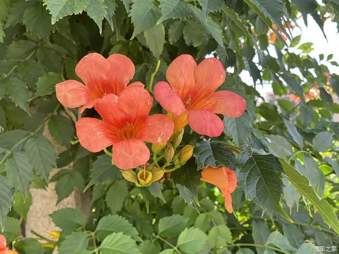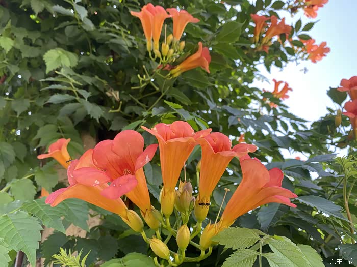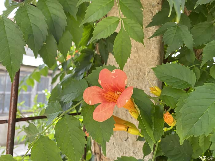 凌霄花开得正艳,鲜绿的柔条纤蔓上,鲜艳夺目的橙红色花朵缀满了枝头,在炎炎的夏日中形成一道美丽的风景。