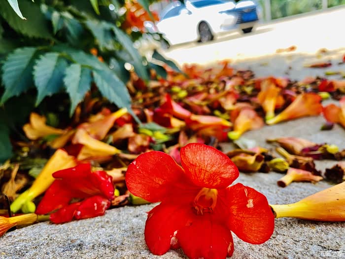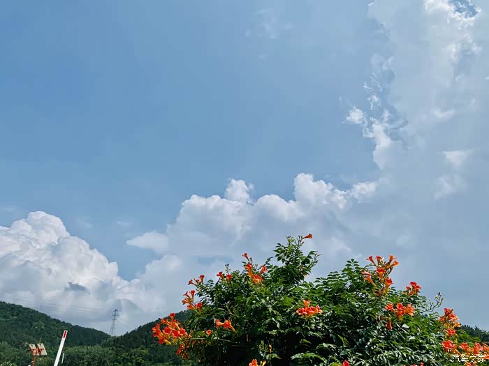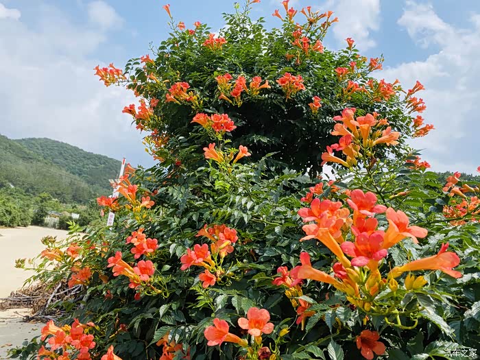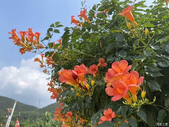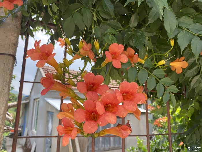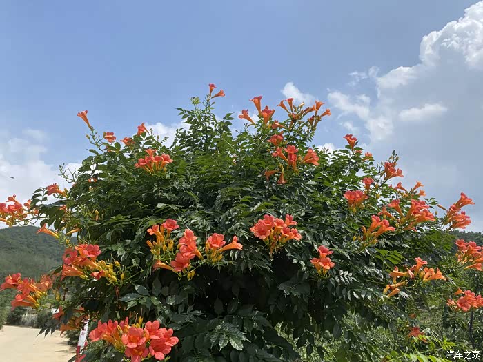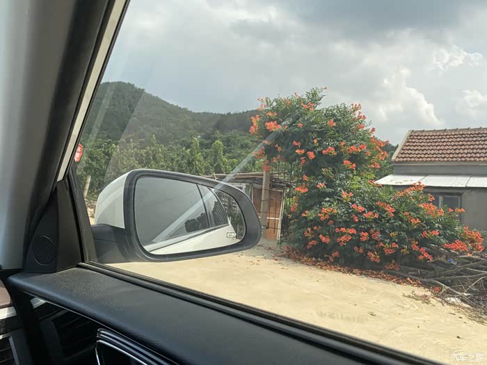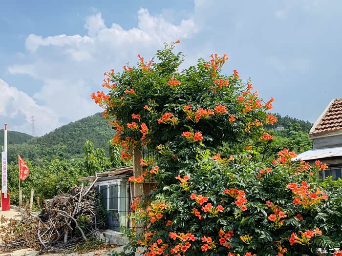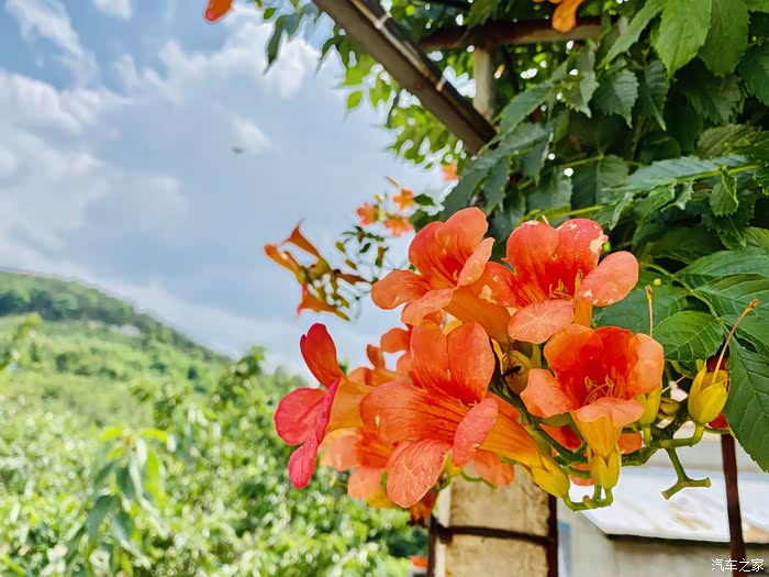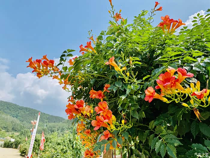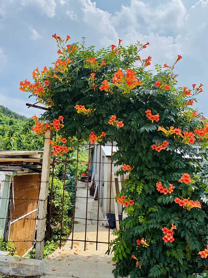 从后视镜就能看出外面的美景了,特别是这个院子的凌霄花门,一会下车我就要去拍它