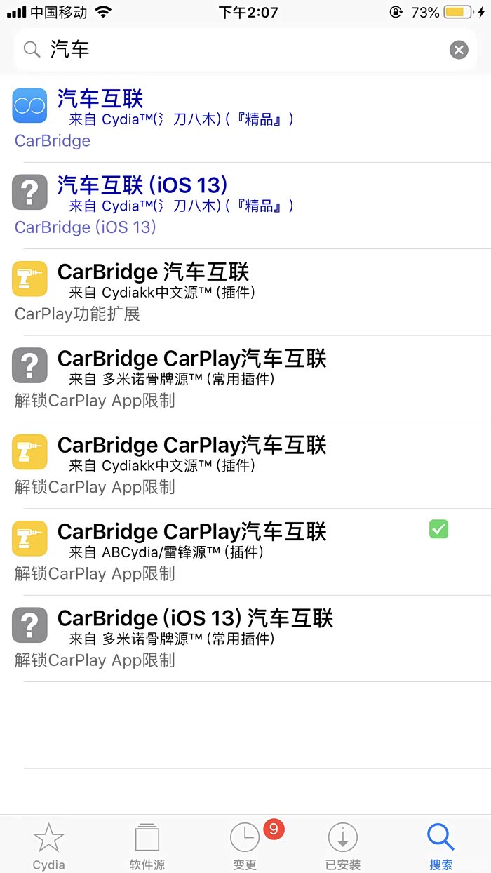(2)安装CarPlay破解插件:Cydia →“搜索”→“汽车”,