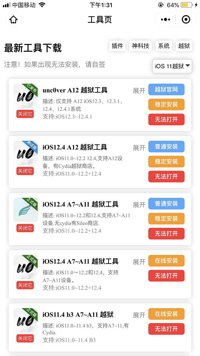 进入工具箱后,选择适合自己系统的越狱工具,建议选择“uNcOver”,一定要选“有cydia”的,这个非常重要,如果没有cydia后面的工作没法开展。