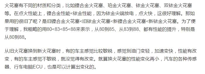 火花塞各种材质及等级都有分类的,有依金,有依铂金,有双铱金,各种材质的使用寿命 和热值不同,当然,价格也不同咯,看你舍得花的钱咯!当然,这些都不算什么,火花塞之中最土豪的还是只有日本本土出售的辽金火花塞,之前有启悦车主在日本海淘回来!对于有没有必要花钱换火花塞,或者启悦值不值得花点钱换,这个见仁见智,也不一一辩论了!有人觉得值得,有人觉得不值得!值得的,觉得原车的材质太一般了,我经济能力花的起,哪怕是一百多,两百多,一次性投资,都可以跑很长时间了,我舍得花,我换的材质都比原车的提升。~~~觉得不值得的,启悦就是一辆经济车型,开得动就好了!这个问题,也没必要成为辩论点,毕竟每个人有每个人的想法!就好像同样是换,有人觉得铱金的够了,有人觉得换依铂金,有的人换辽金。就好像冬天吃东西,有人觉得吃猪肉我有热量够了,有人觉得我吃牛肉暖和一点,有人觉得我吃鹿肉更爽一点。道理一样,我不换,我用原车也可以开得动啊,没有说一定要换的。