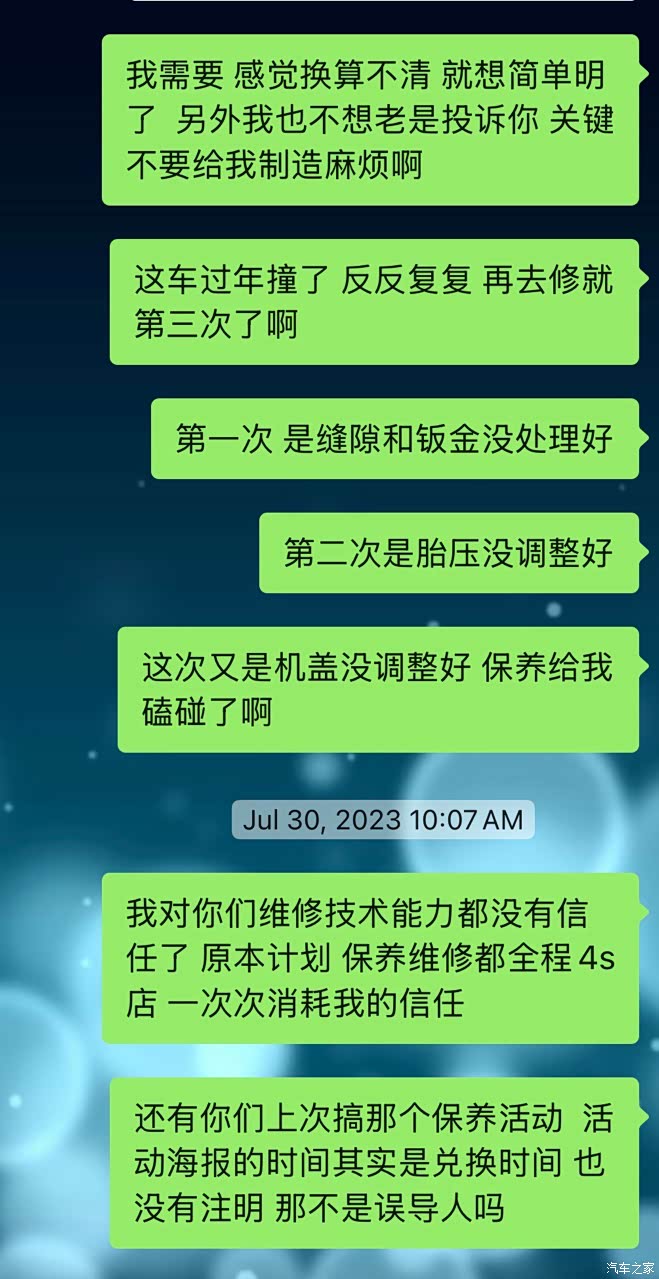说实话,我不是一个爱折腾的人。但经历了前后4次返修,到今天方向盘依然偏左,钣金不平整、维修磕碰反复出现、后备箱进水、挂钩盖无故损坏...我真的开始怀疑,是不是只有“豪车”才配被认真对待?是不是因为我是女生,买的是标致408,就该被默认“将就点”?买车是开心的事,不该成为一场“隐忍式消费”。