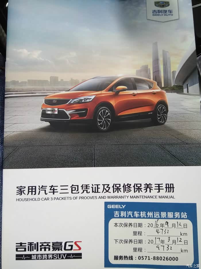 回家就在网上到处查吉利汽车的车型,最后看见之家论坛叫他扣肉丝,还未更名叫帝豪GS,从订车到5.2到提车8.24到首保9.12,目前行驶4800KM没有任何问题出现。