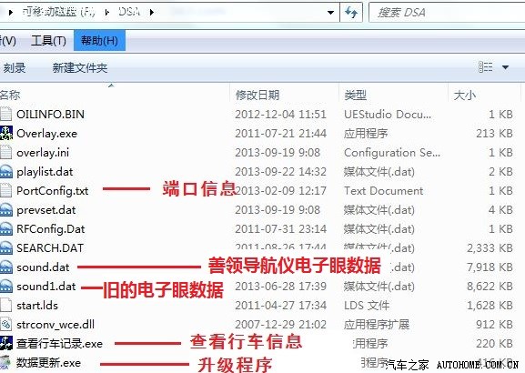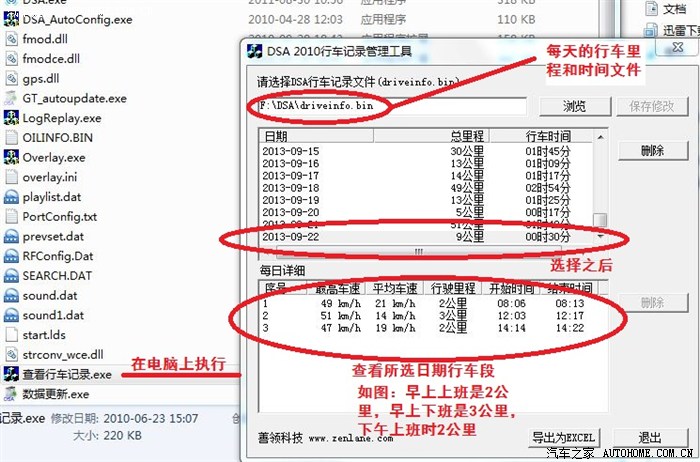 打开DSA目录里的查看行车记录,按上图选择即可。行车的日志保存在DSA目录下的driveinfo.bin文件里面。可以查看每天总里程和每段里程。