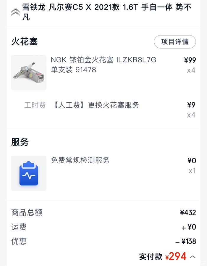 翻看了App,雪铁龙官网上火花塞的售价不低,也没搞活动,若加上4S店的工时费更是肉疼。比较了几个大电商平台,最终以不到300的实付价定了原车同款,包安装。选择的门店离家很近,步行几分钟。