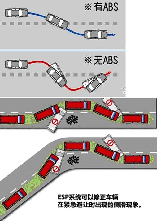 (1)ESP。这个车子最大的遗憾就是全系没有ESP,我也是纠结了好久,不过开了这么多年没有ESP的车子,我觉得良好的安全意识和驾驶习惯更重要吧。有ESP的车主更不能觉得ESP是万能的,相反,ESP只是ABS的延伸和辅助,没有ABS就没有ESP,而且ABS的意义要远大于ASP。如果看过ABS和ESP功能介绍的文章,相信你也会发现,两种文章里面的插图其实都很相似(看插图)。就像安全气囊只是安全带的辅助一样,不系安全带,安全气囊弹开反而会加重伤害,好多人以为有安全气囊就不系安全带了,结果导致车祸丧命(安全带和气囊下文中会有阐述)。当然也有人以为自己上了四驱就肆意越野,导致陷车,所以,淹死的都是会水的,我们没有ESP的车主开车都小心点儿吧。