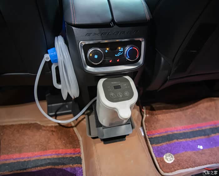 12V 120W的车载热水器,体积几乎可以忽略。不需要逆变器,储能电池直接供电(探险者的点烟器接口标称的10A,120W,但超过100W的电器还是不要直接插点烟器接口,大概率会把接口烧坏),20分钟能烧开水400毫升(海拔500米),会自动上水,和家里的功夫茶自动热水壶一样。安装在前排扶手箱后面,不占空间也很安全。可以配水箱,也可以不用水箱直接从矿泉水瓶中抽水。