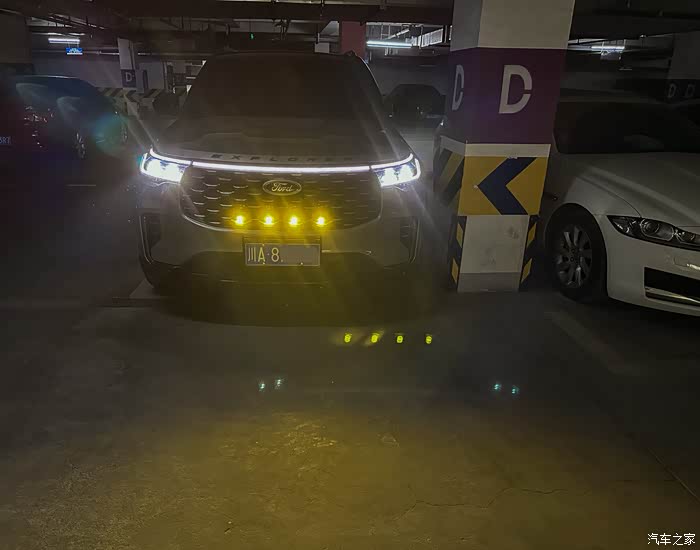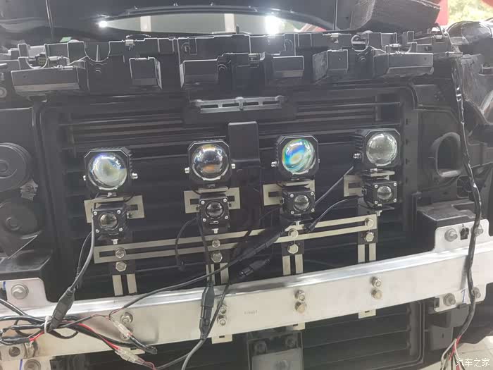 2023款全系取消了雾灯,所以自行安装了中网雾灯和射灯,射灯为激光灯,雾灯为LED灯,都是低色温黄光以提高雾天穿透性能,雾灯远近光可调,射灯和雾灯都带透镜,避免散射影响对面。探险者中网内部没有固定中网灯的装置,所以这个需要定制灯架。另外只有ST版的蜂窝中网才能装在内部,其他版本中网的遮挡太多,效果应该不会太好。要让灯的位置刚好对应中网孔的位置很困难,我自己定做了三次支架才搞好,支架要保证灯头能够上下左右平移以及旋转,只有各个角度都能调整才能保证每个灯都正好对应中网孔的中心点,以及后期调整合适的照射角度。