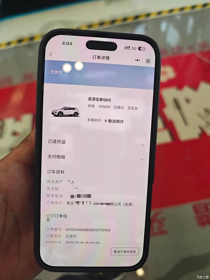 订购的是启源Q05,405max,订车价格是89900。是在10月20多号定的。因为当时是盲订。
