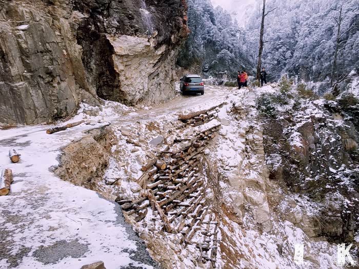 但是,我们也没有那么一路顺风,最终还是在一个大弯处和一个陡坡处遇到了挑战。第一个挑战的大弯处是连续转弯,以及长上坡,加上很厚的积雪,加上我们的确没有开过这样的路况,所以1.4T没有四驱的小侠就因为缺乏动力而在冰雪上慢慢慢的溜车了,差一点就滑到排水渠里,右后门差一点也撞到山石。我们也是第一次经历这样的过程,后排女声各种尖叫,而我们男生还是比较冷静,千钧一发的时候控制住了车,小侠停住了,没有继续下滑。这时候一起自驾的同伴们立马来救援我们,给我们垫了山石,一起想办法怎么脱困!(