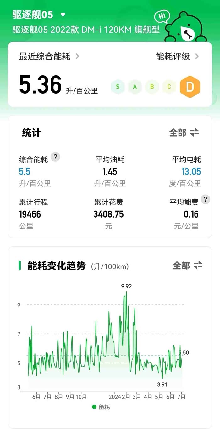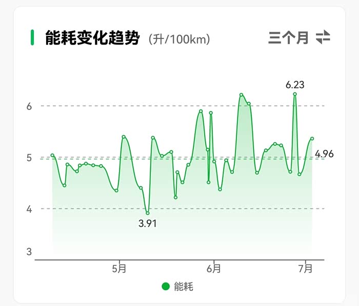 查看了最近三个月的能耗水平,就到了4.9升/百公里的附近。如果再排除掉我睡午觉能电耗,预计驾驶实际能耗应该在4.5左右,甚至更低一些。