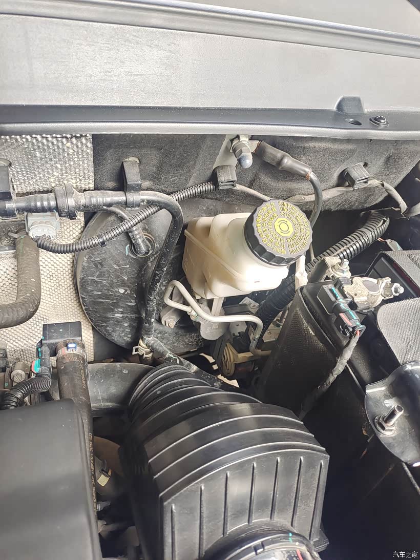 刹车油储液罐就在电瓶旁边,黄色的盖子很显眼。我检查了液位在标准刻度内,油液没有浑浊,制动管路也没有渗漏。最近踩刹车时踏板反馈正常、制动力稳定,说明刹车系统状态良好,山区和高速路段行驶更有信心。