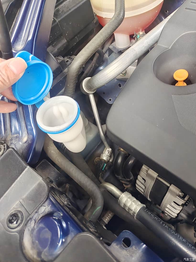 年底高速上虫胶和灰尘多,玻璃水必须备足。我打开蓝色盖子的储液罐,加入了-25℃的防冻玻璃水,彻底喷净了旧液,避免不同冰点混兑降低防冻效果。同时也调整了喷头角度,确保清洁效果,还备了一小瓶应急用。