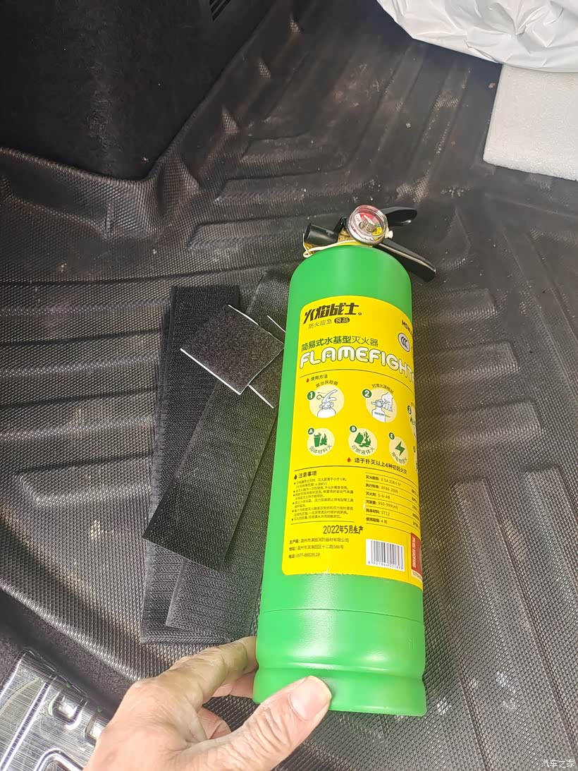 我这款水基型灭火器压力指针在绿色区域,生产日期是2022年5月,仍在保质期内。我把它固定在后备箱易取的位置,确保车辆突发火情时能快速取用,也提醒大家要定期检查灭火器的压力和有效期。