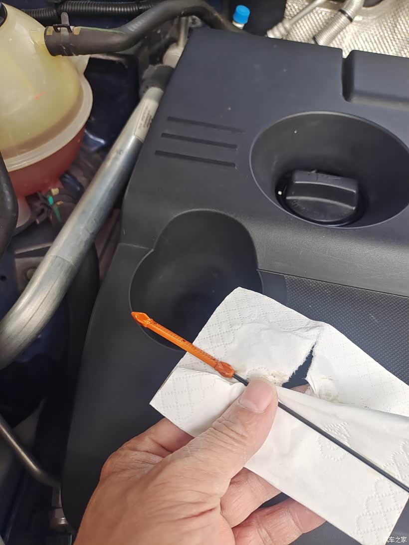 冷车状态下拔出机油尺,用纸巾擦净后再插入,观察油位刚好在MIN和MAX之间。油质看起来还算清亮,没有发黑和杂质,说明不用提前更换,只需补加同型号的5W-30全合成机油即可,长途高负荷运转也更安心。