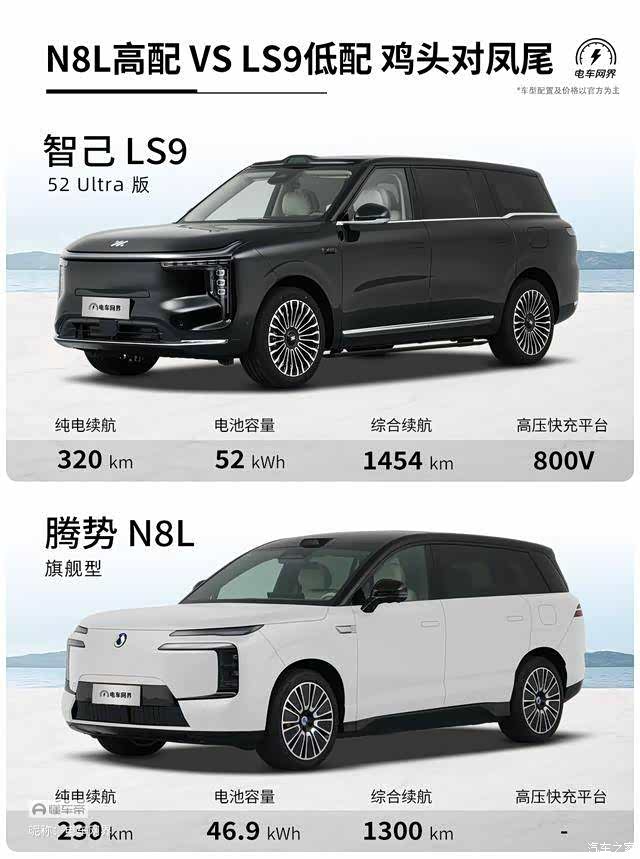 到底是要X9的双侧滑门、航空座椅、魔术三排、超级尾箱、三图灵芯片2200TOPS算力、行业最强语音座舱,但两驱8秒加速、没有电动方向盘、没有FM广播、手动前排遮阳帘、单开门冰箱;还是要LS9的24°后轮转向、四驱4.9秒加速、三零重力、机械按摩、B&O音响、双开门冰箱、主驾电动门、电动脚踏板、21寸轮毂,但满员长途肯定不够放行李的尾箱?(电池方面,虽然智己LS9的52ULTRA版比小鹏X9超级增程1602ULTRA版小10度,但价格也要便宜1.3万,所以算扯平了。)