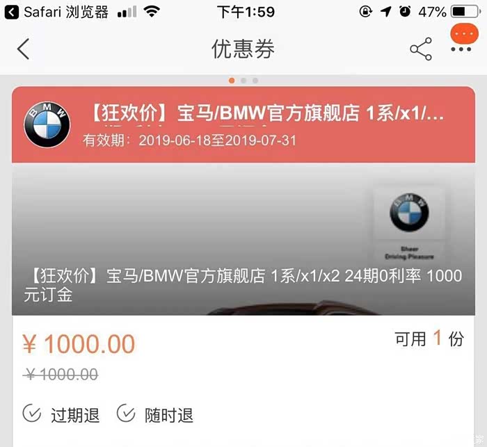 1、某猫、某狗、汽车之家有个1系、X1的24期免息活动,这个要抢的618当天凌晨抢,大概有1500个名额吧,我有幸抢到一个。