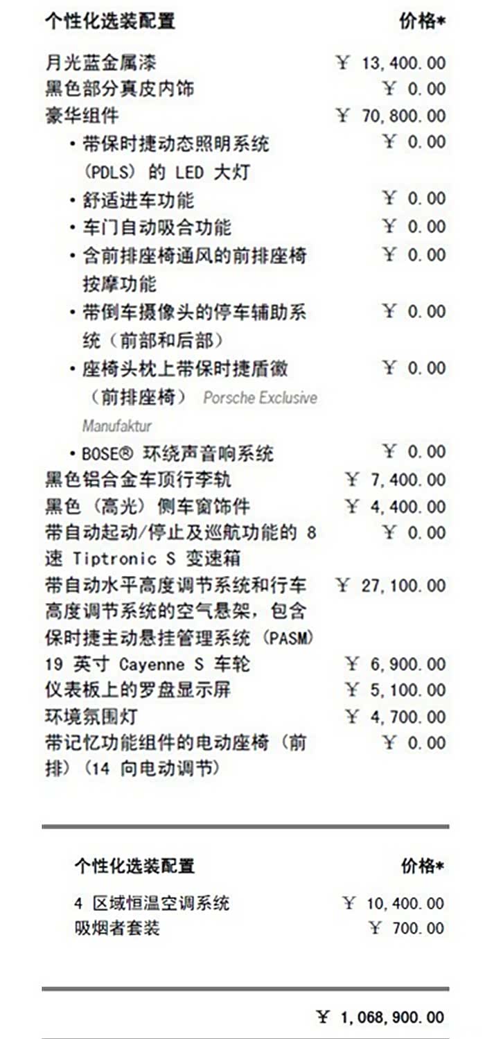 本人于2018年9月份提的18款入门版保时捷新卡宴,当时选配费用是15万多,车架91万多,优惠了7个点,但是要求装潢2万的alcantara顶棚,七七八八费用加起来落地总共花了110多万。后来,本人又花了差不多50万对车子进行了各种升级改装,前后一算这台车总共花了160万,不算不知道,一算吓一跳~