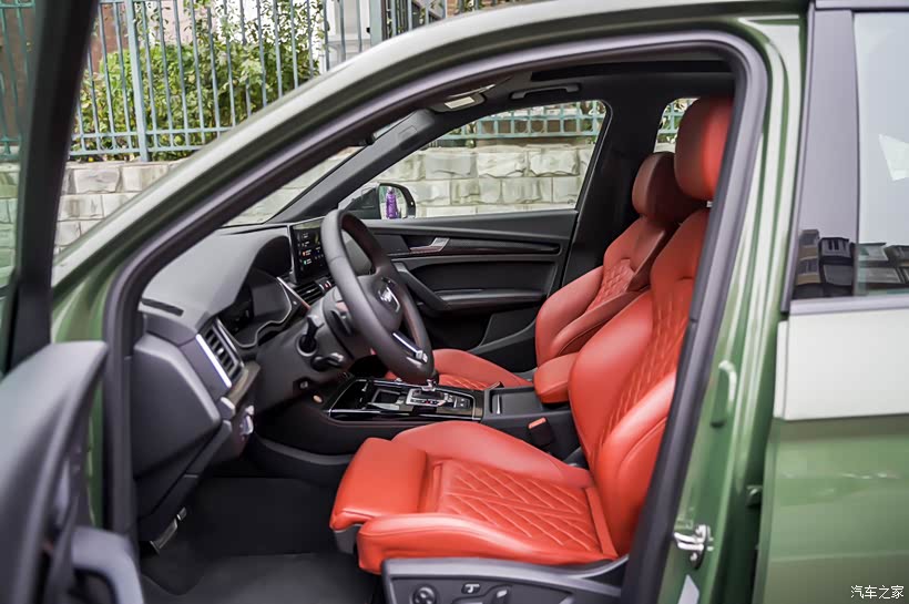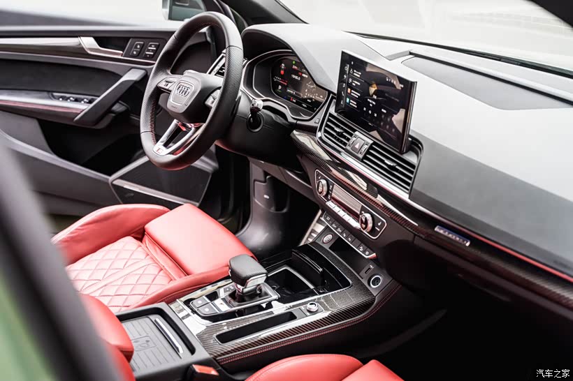 内饰:不是沉闷单一的黑色,换成了张扬时尚的红色纳帕真皮座椅,前排座椅的运动设计更加凸显了SQ5性能车的风格;平底方向盘+档把的打孔设计+碳纤维的内饰条,把控细节做到了极致👏🏻