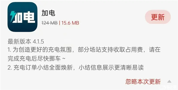 近日,蔚来加电APP迎来了新版本升级推送,此次更新的主要内容是“部分场站支持收取占用费”,其目的是为了让充满电的车主尽快挪车,把充电位让给其他需要充电的车主,旨在创造更好的充电氛围。