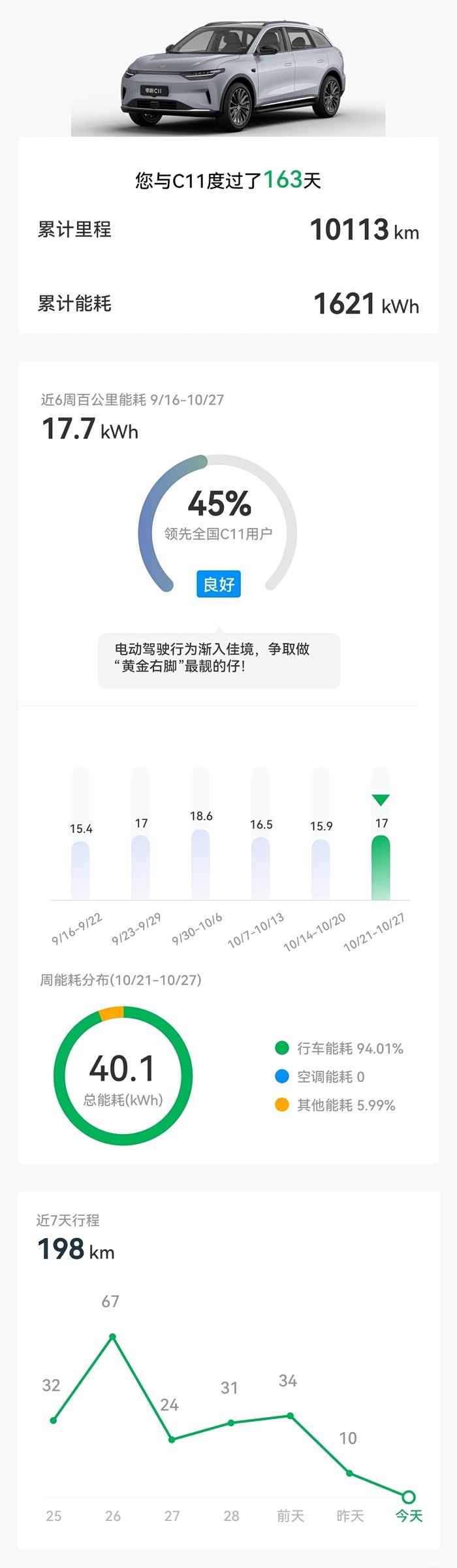 就像今天下中雨➕堵车,能耗就高一些了。