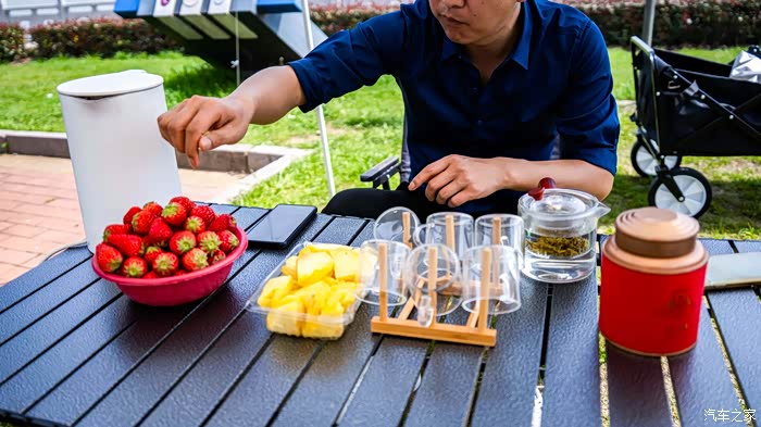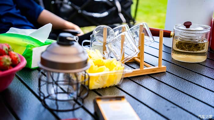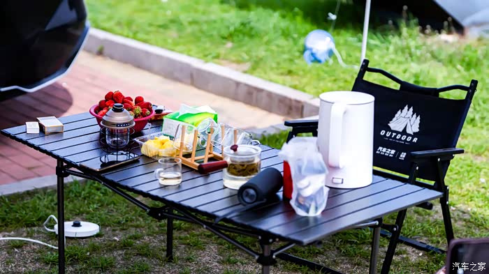 露营车 折叠凳(3把)可收纳折叠桌 帐篷(带天幕)防潮垫 放电枪 烧水壶 茶叶 零食 水果 茶杯 与饮用水