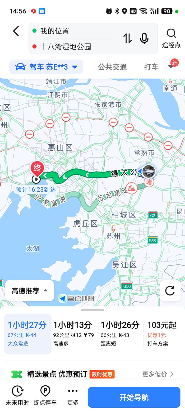 常熟出发走锡太路行驶28公里左右(注意锡太路大型拖挂车比较多)上金城快速路转南内环快速路 在转西内环快速路 -环太湖大道行驶18公里,全程67公里,选择国道行驶更快更省钱,如果是走高速反而慢很多!!