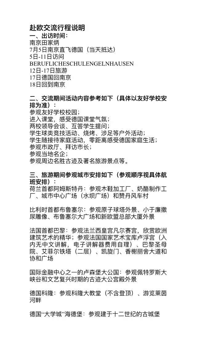 7月5日至7月18日,我们出访欧洲,其中6号到12号在寄宿生活在他们家中,双方对等接待。12号到17号,在欧洲旅游。7月18号回国。