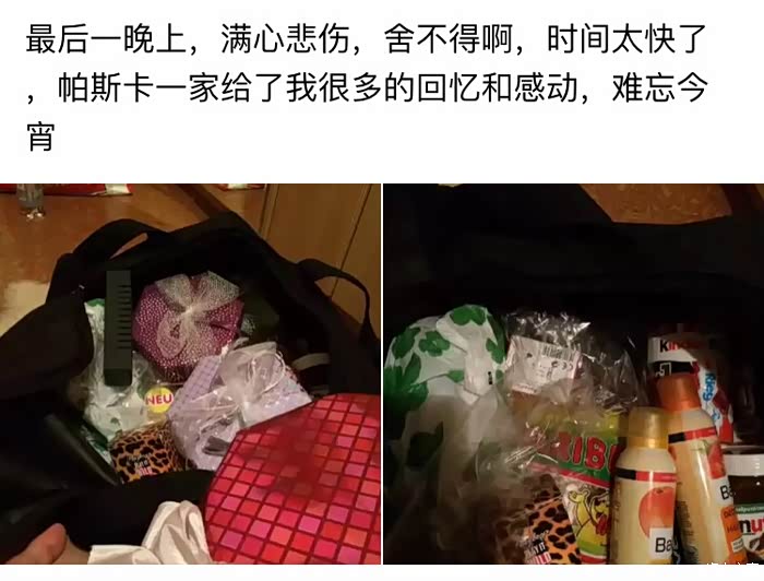 回家后他又给了我让他妈妈从超市带来的礼品。他的爸爸妈妈又送给我了一些平时见过比较喜欢的小礼物,虽然不如中国人送礼如此贵重,但却是心意满满。拿过他们带我洗好晾干的衣物,收拾着行李,静静等待着时间的流逝。