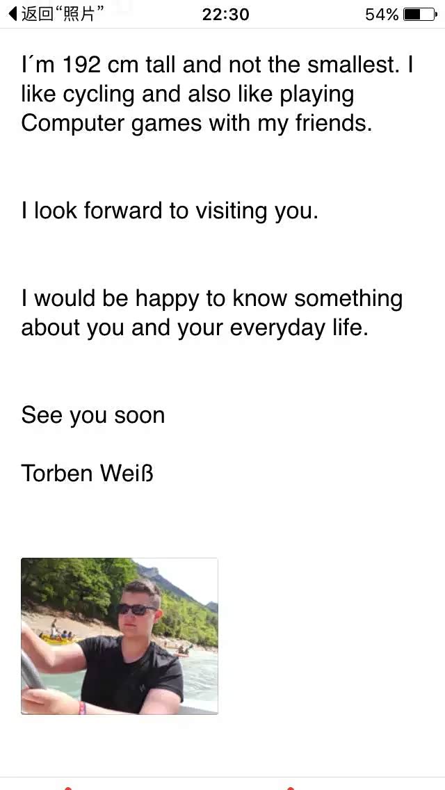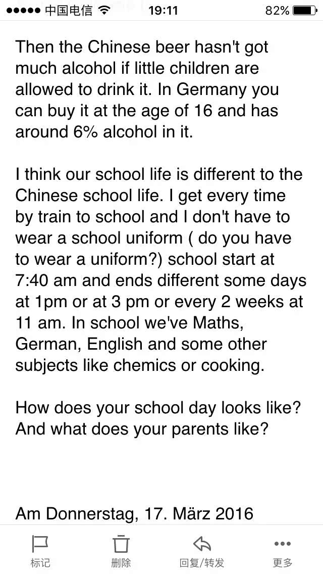 在来访前20天,我的邮箱就收到了即将接待交流生托尔本的惊喜,当时的我迫不及待地截图发了动态。之后的20天里,每天晚自习放学回家第一件事就是打开邮箱,看看托尔本是不是又给我发了什么邮件,第一时间进行回复。邮件交流感受最深的就是,自己的英语水平面还是够用的,甚至比托尔本的笔头功夫还要好,至少自己会用各种从句,语法也比他好一些,这也大大增强了自己对英语的兴趣和交流的自信。