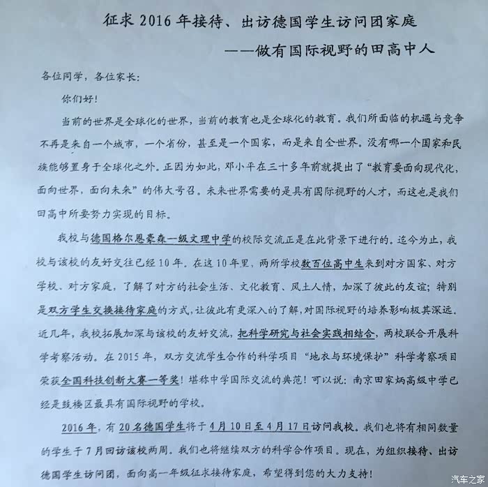 一次偶然的机会,校园广播播报,学校将迎来一年一度的德国交流活动,届时将有德国学生来访,并可以进行对等接待。从小就听说过交流生,如今这么好的机会,使原本就乐于交往的我顿时来了兴趣。回到家,我就迫不及待地和父母说了这件事,原本以为要商量个半天才有结果,没想到爸妈十分支持,二话没说就同意了。