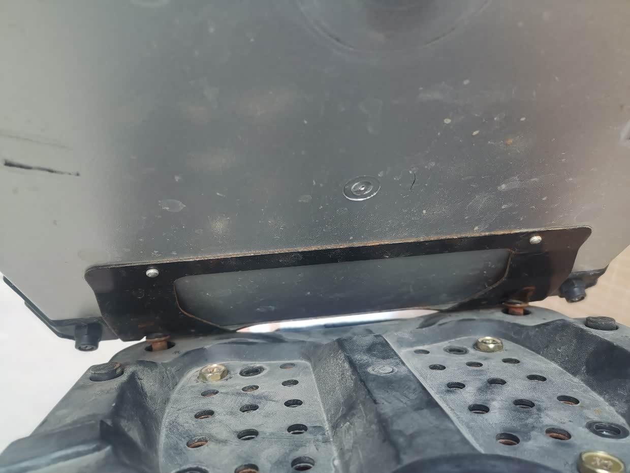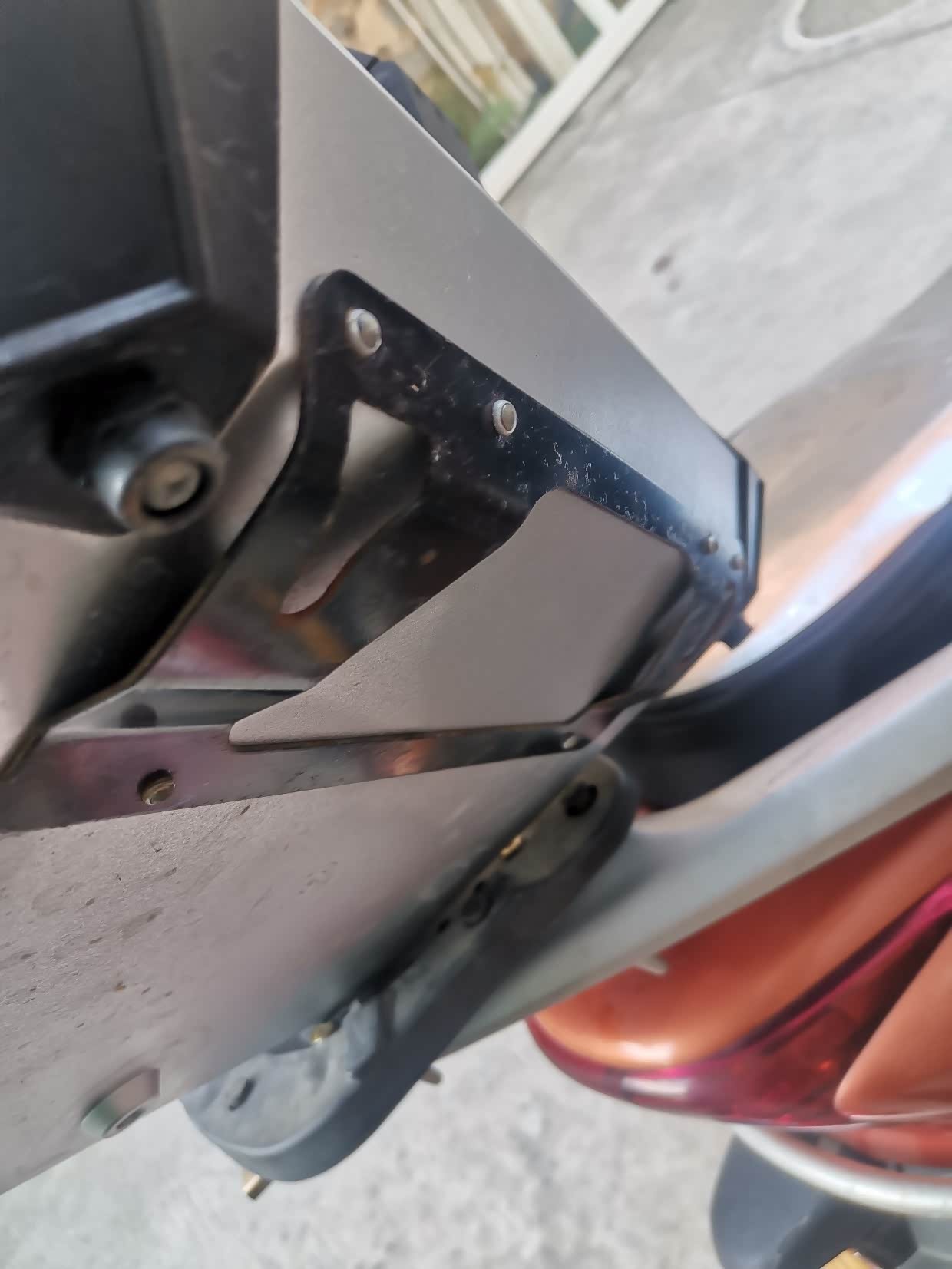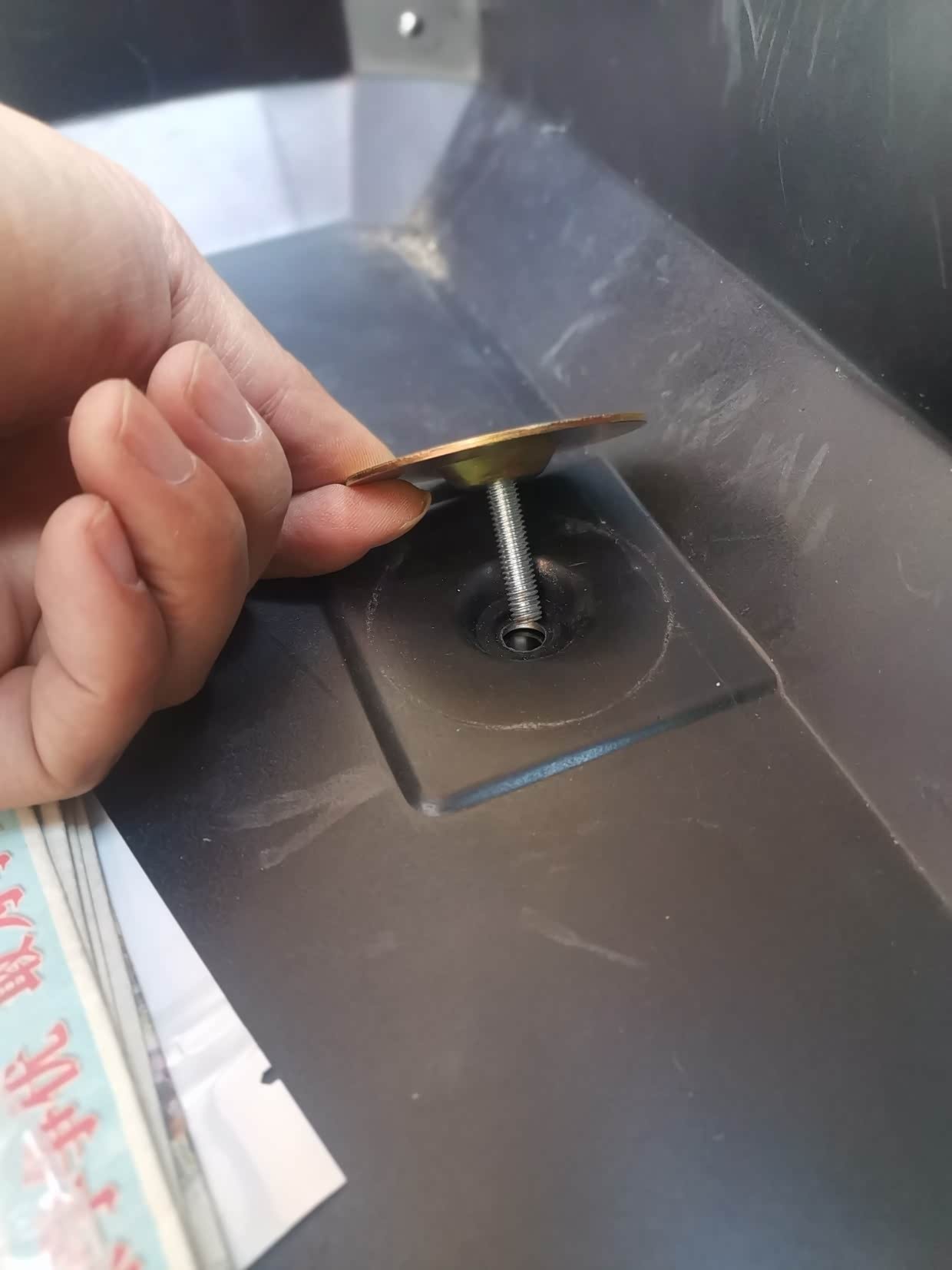 安装好后的底板,底板前面有两个蘑菇钉是用来卡在尾箱底端支架上面的,后面的大螺丝就是固定尾箱和底板的螺丝,以后要临时拆卸尾箱就只需要拆这个螺丝就可以了。