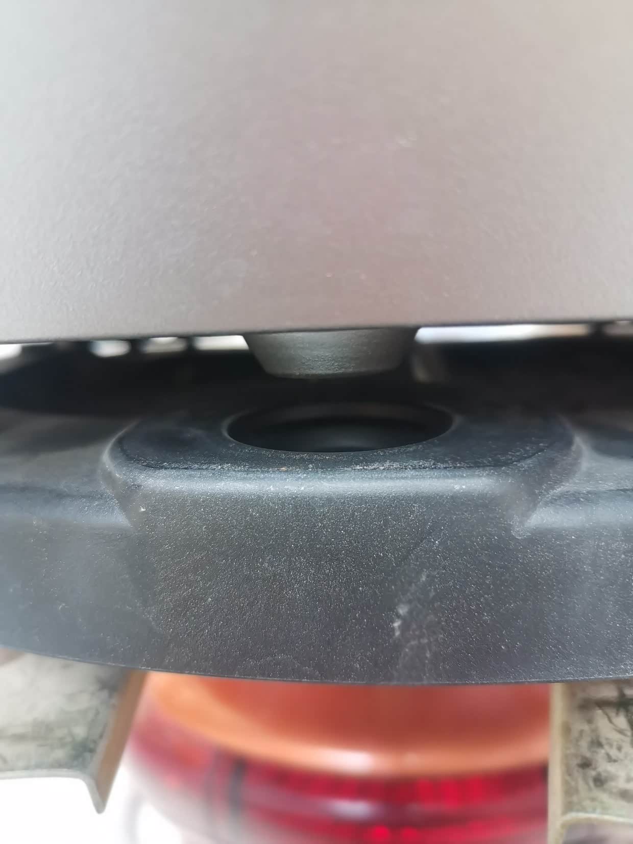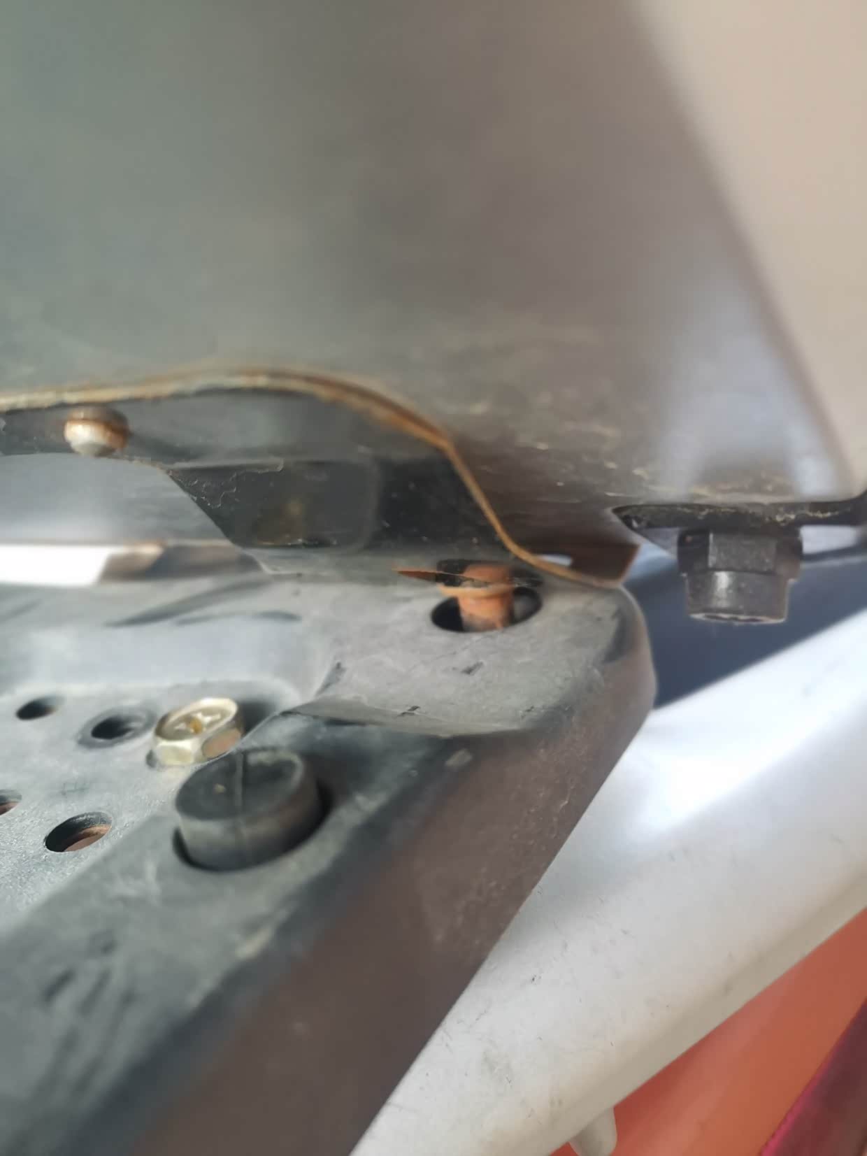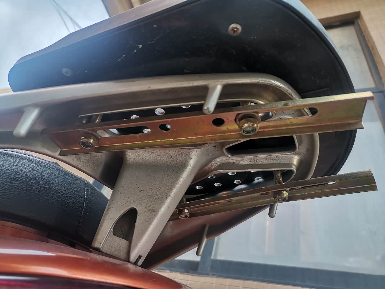安装好后的底板,底板前面有两个蘑菇钉是用来卡在尾箱底端支架上面的,后面的大螺丝就是固定尾箱和底板的螺丝,以后要临时拆卸尾箱就只需要拆这个螺丝就可以了。